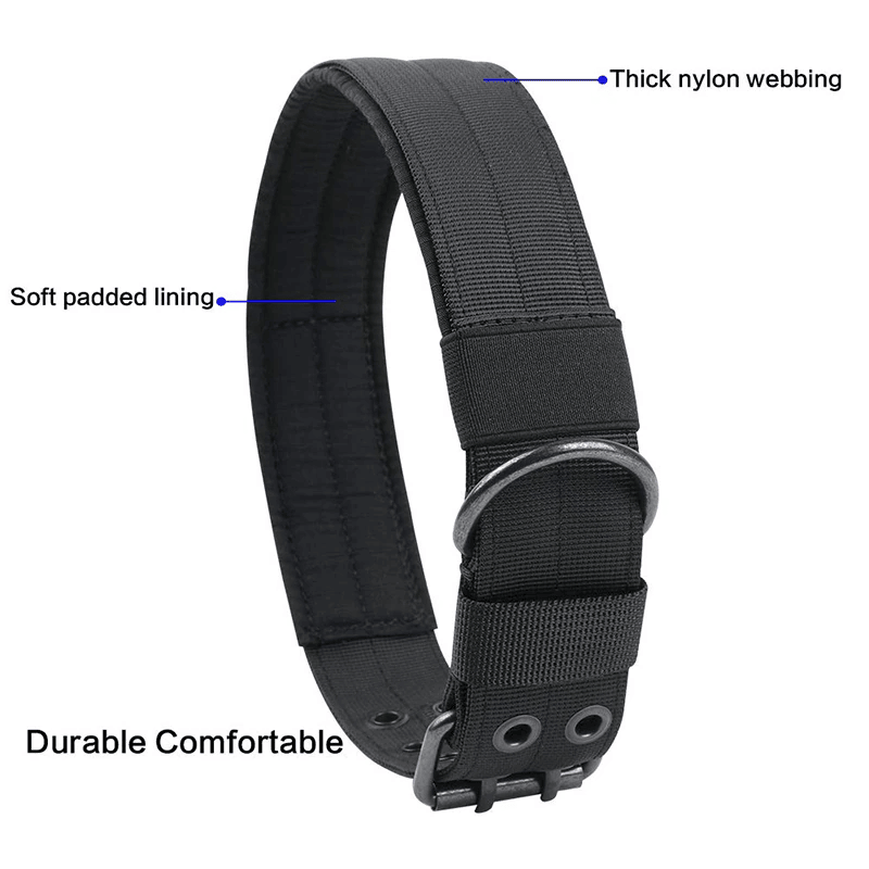 • MORE SAFETY FOR YOUR CANINE - In addition to being tactical and trendy, wide large dog collars tend to be safer and stronger than their thin counterparts. The extra material distributes pressure against your dog's throat more evenly, which can REDUCE TRACHEAL DAMAGE in the long run.