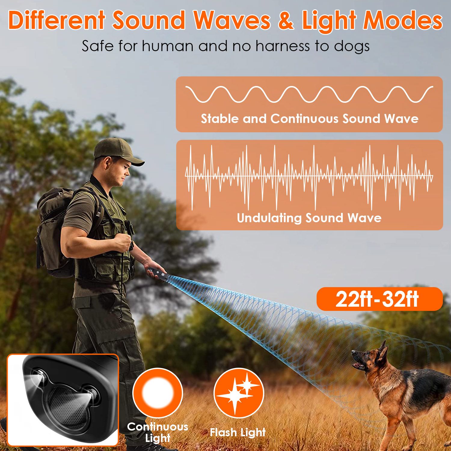 *2 Light Mode*:2 Different LED light modes expand the function of this anti-bark device. Long-bright mode is helpful when walking your dog at night,as for flashlight,it not only can be used as a reminder and warning to the dangerous approaching dog,but also SOS alarm to call people around for help.